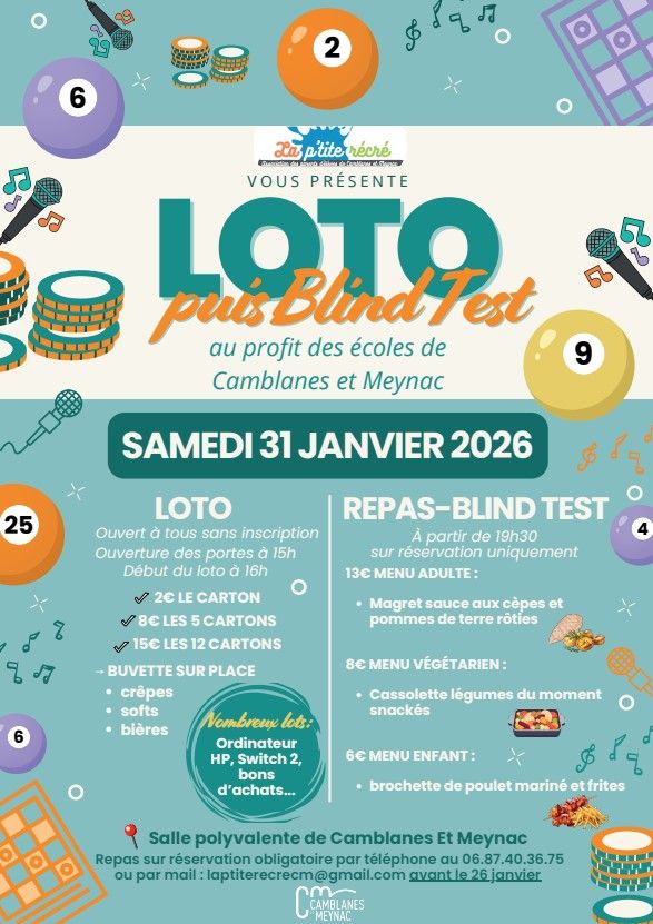 Réservez votre samedi 31 janvier après-midi et soirée ! L'association des parents d'élèves des écoles organise dans la salle polyvalente un grand loto suivi d'un repas-blind test :