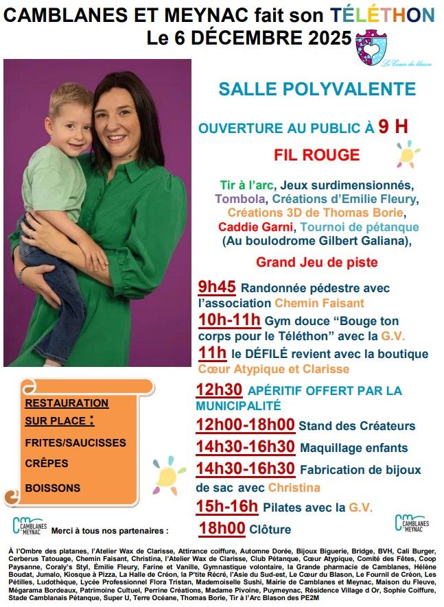 Merci aux partenairesÀ l’Ombre des platanes, l’Atelier Wax de Clarisse, Attirance coiffure, Automne Dorée, Bijoux Biguerie, Bridge, BVH, Cali Burger, Cerberus Tatouage, Chemin Faisant, Christina, l’Atelier Wax de Clarisse, Club Pétanque, Cœur Atypique, Comité des Fêtes, Coop Paysanne, Coraly’s Styl, Émilie Fleury, Farine et Vanille, Gymnastique volontaire, la Grande pharmacie de Camblanes, Hélène Boudat, Jumalo, Kiosque à Pizza, La Halle de Créon, la P’tite Récré, l'Asie du Sud-est, Le Cœur du Blason, Le Fournil de Créon, Les Pétilles, Ludothèque, Lycée Professionnel Flora Tristan, Mademoiselle Sushi, Mairie de Camblanes et Meynac, Maison du Fleuve, Mégarama Bordeaux, Patrimoine Cultuel, Perrine Créations, Madame Pivoine, Puymeynac, Résidence Village d Or, Sophie Coiffure, Stade Camblanais Pétanque, Super U, Terre Océane, Thomas Borie, Tir à l’Arc Blason des PE2M