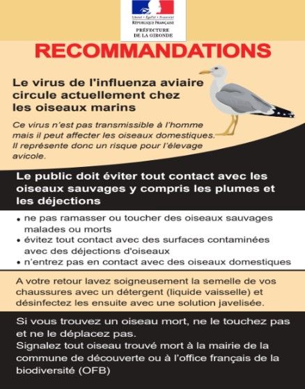 A l’occasion de la période de migration, de nombreux oiseaux sauvages traversent notre territoire. Certains d’entre eux sont susceptibles d’être porteurs de l’influenza aviaire, un virus non transmissible à l’homme qui atteint uniquement les oiseaux et volailles. Cette situation peut occasionner la découverte d’oiseaux morts sur le territoire départemental.
