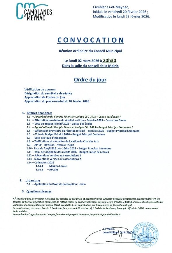 Le conseil municipal se réunira le lundi 2 mars à 20h30 à la mairie (salle du conseil). Les élus examineront les sujets suivants :