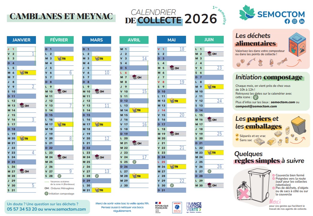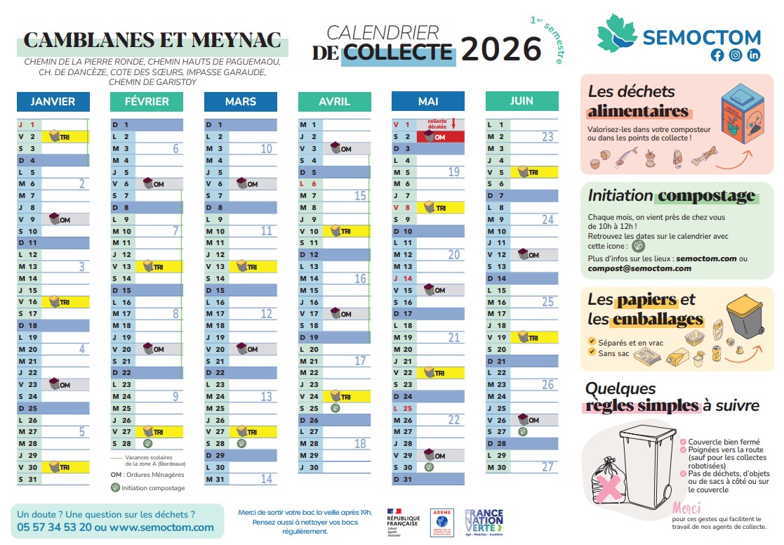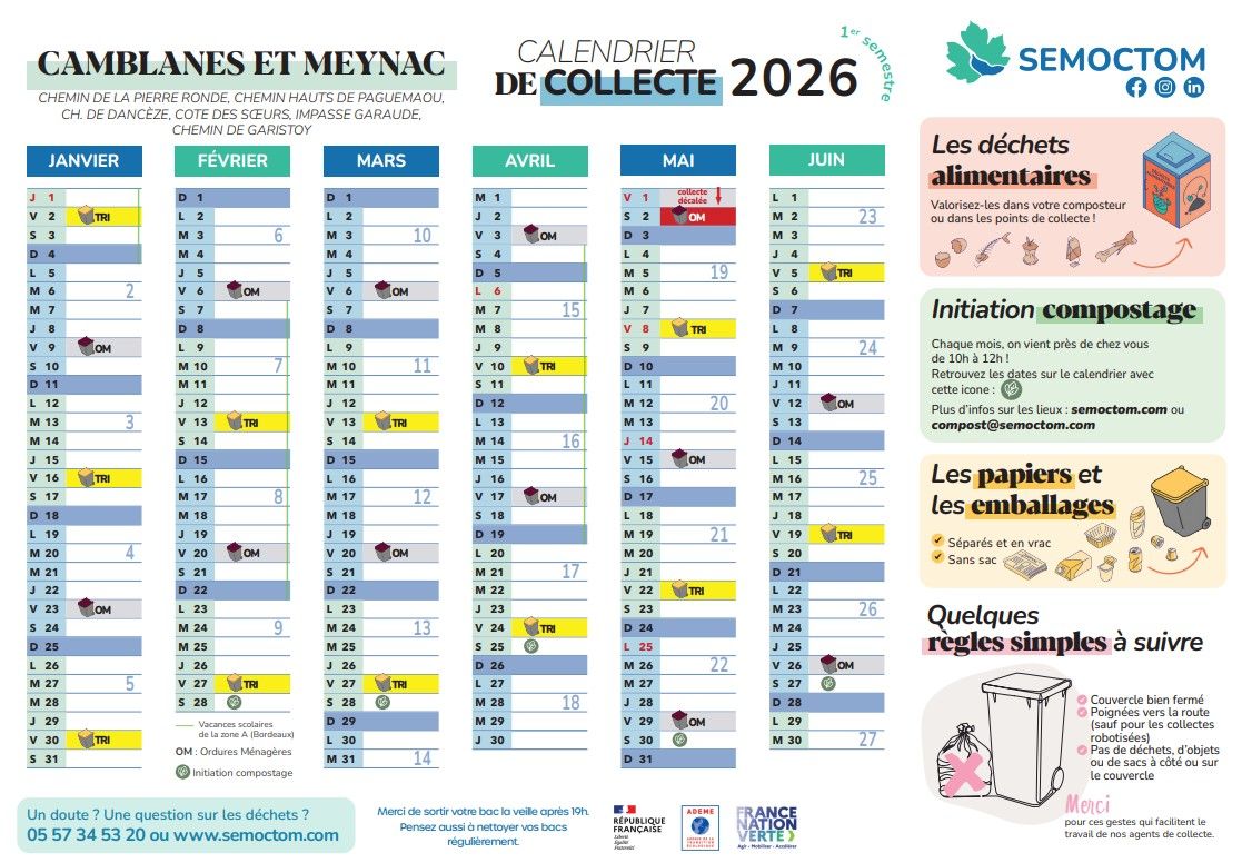 Depuis mars 2025, une nouvelle étape a été franchie sur l'ensemble du territoire avec la modification des jours et la fréquence des collectes des ordures ménagères. Les secteurs de collecte ont été supprimés (à l'exception de collectes en petite benne) et les communes sont collectées le même jour de la semaine avec une alternance chaque semaine entre les ordures ménagères (bac marron) et les déchets recyclables (bac jaune). Pour Camblanes et Meynac, le jour de collecte est le mardi.